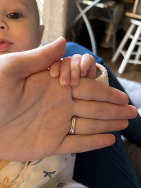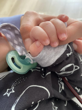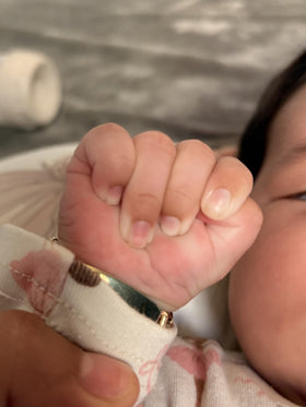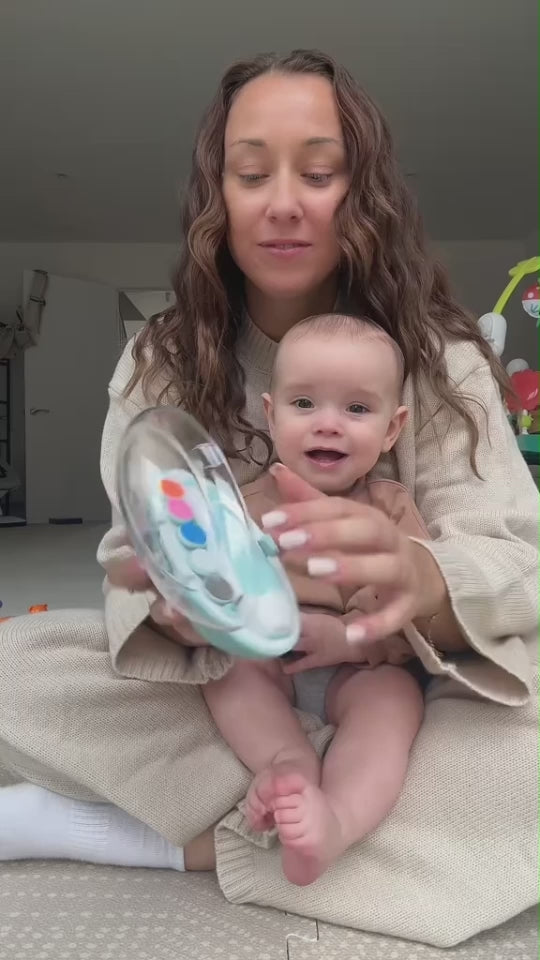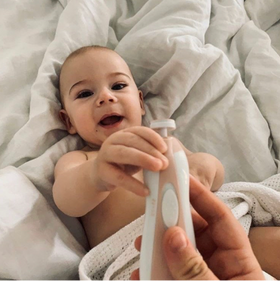 No te preocupes, Tessorie™ está diseñada para usarse con una sola mano. Así puedes sostener a tu pequeño firmemente con el otro brazo mientras limas sus uñas. Además, su sensor de seguridad protege sus dedos incluso si comienza a moverse.